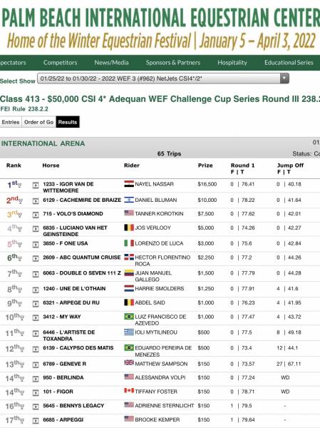 Volo's Diamond 3ème place CSI4* Adequan WEF Challenge Cup 27 janvier 2022 Photo Texte A nouveau un excellent résultat pour Volo's Diamond et Tanner Korotkin avec la 3ème place dans l'Adequan WEF Challenge Cup III ! Ci-dessous la vidéo du barrage : Attachments Photos & vidéos Chevaux liés VOLO'S DIAMOND Partager